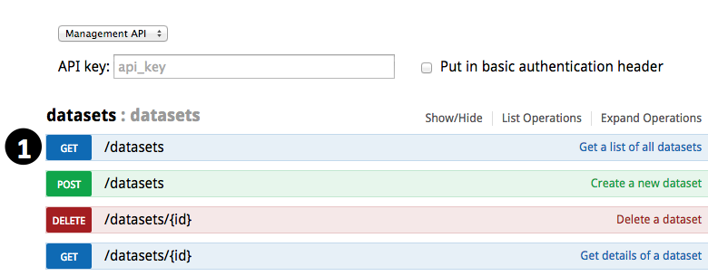 - Find the ID of your dataset. If you haven’t copied it so somewhere, you can try to find it in the list of all your datasets. Expand”datasets”, go to “GET /datasets”, ”,click on the “Try it out!” button, then you will see all your datasets in the returned result below.