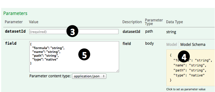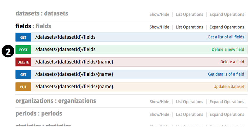 - Expand “fields”, go to “POST /datasets/{datasetId}/fields”