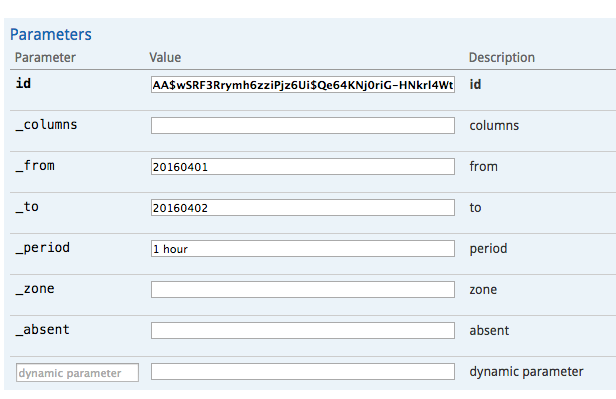 - _period – aggregation period. For example, “1 hour”, “5 minutes”, “10 hour”. A trailing “s” can be appended if you like. If there is only one aggregation period in the aggregation period hierarchy then you don’t have to specify it.